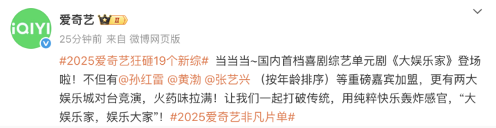 4月23日,爱奇艺举行“2025爱奇艺世界大会”,并官宣19个新综艺,其中包括国内首档喜剧综艺单元剧《大娱乐家》,演员孙红雷、黄渤、张艺兴加盟。
